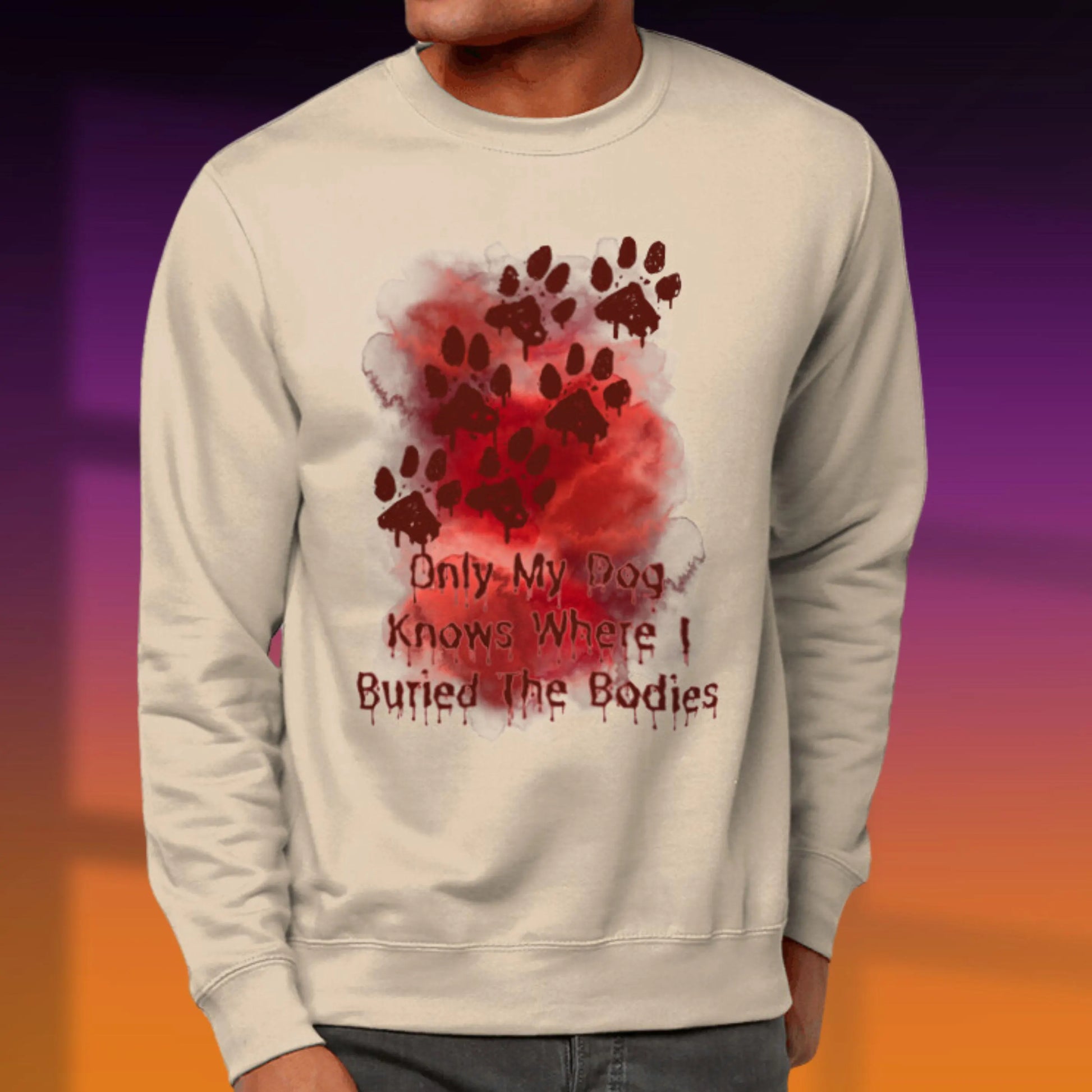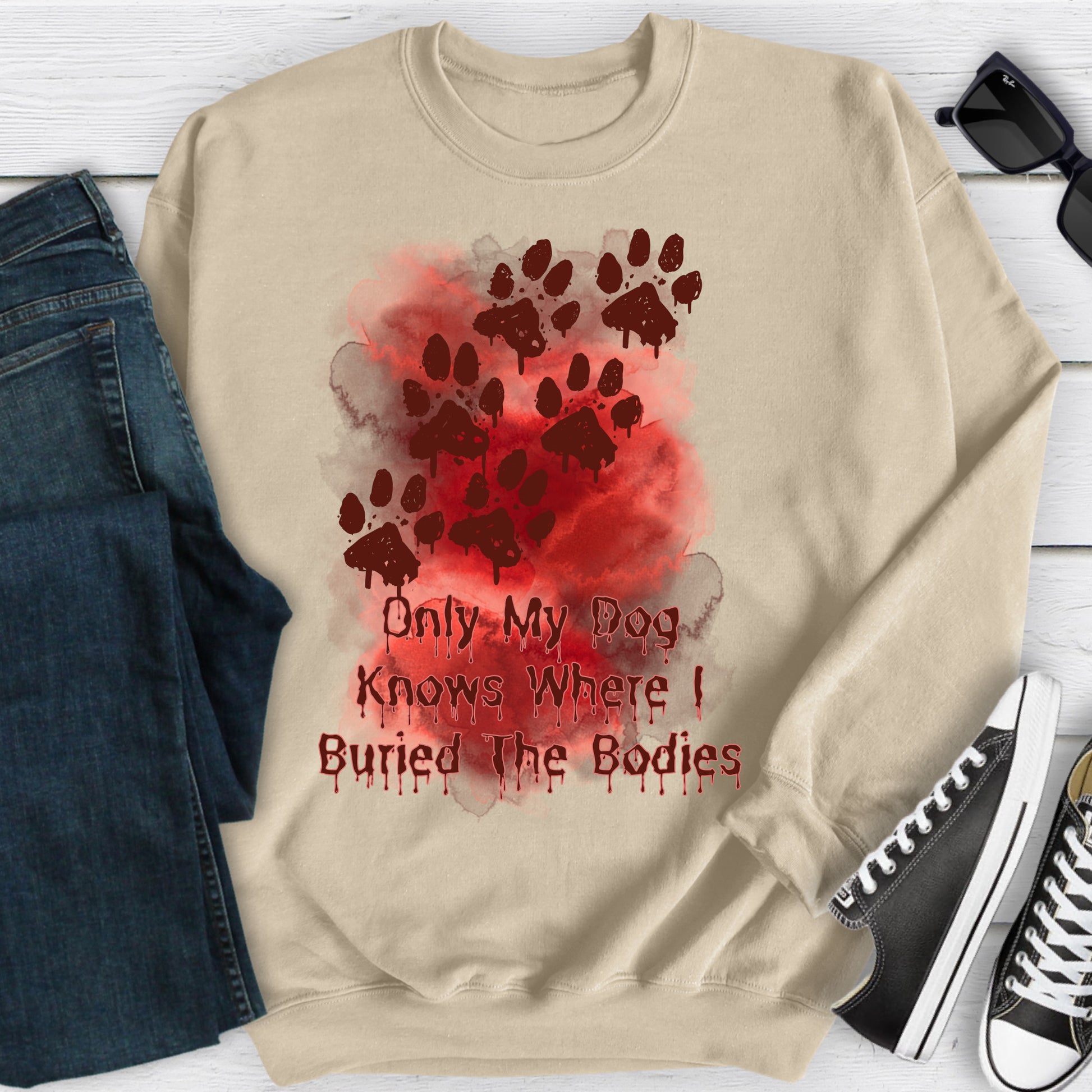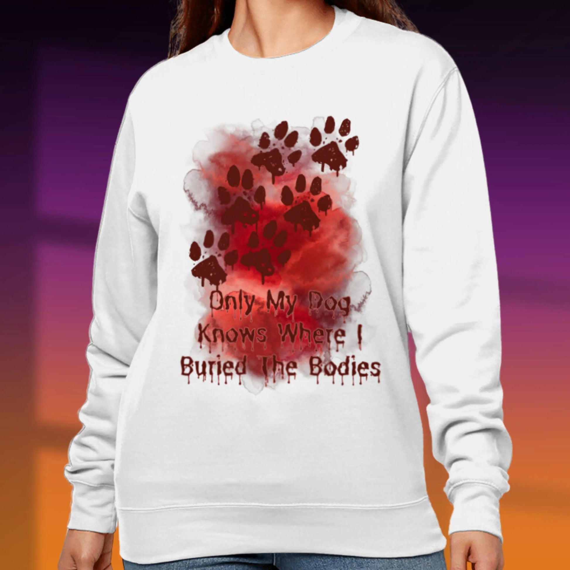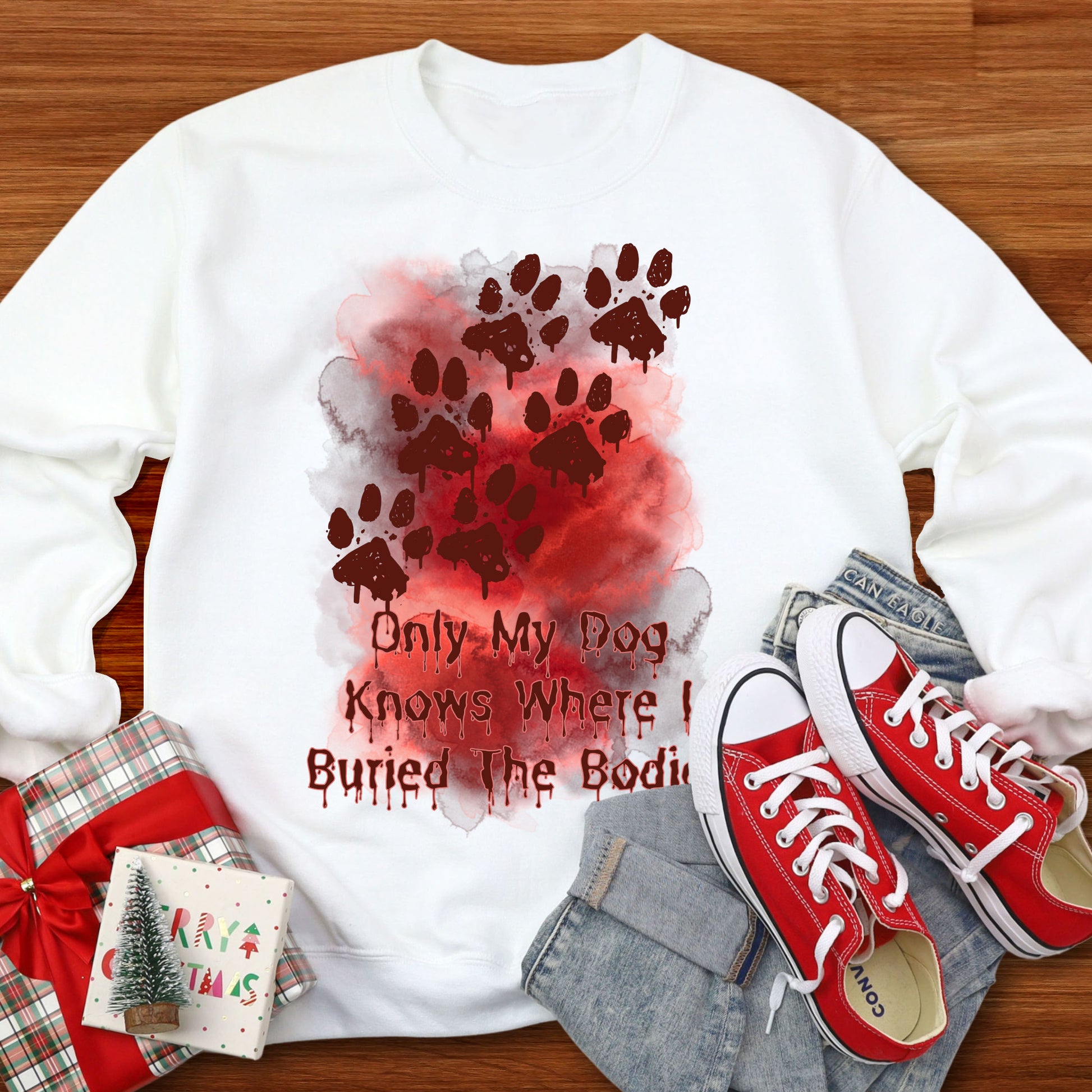 Blood stained paw prints dog lover design. Only my dog knows where I buried the bodies blood spatter sweatshirt is a great Halloween design and an ideal dog lover gift for spooky season.