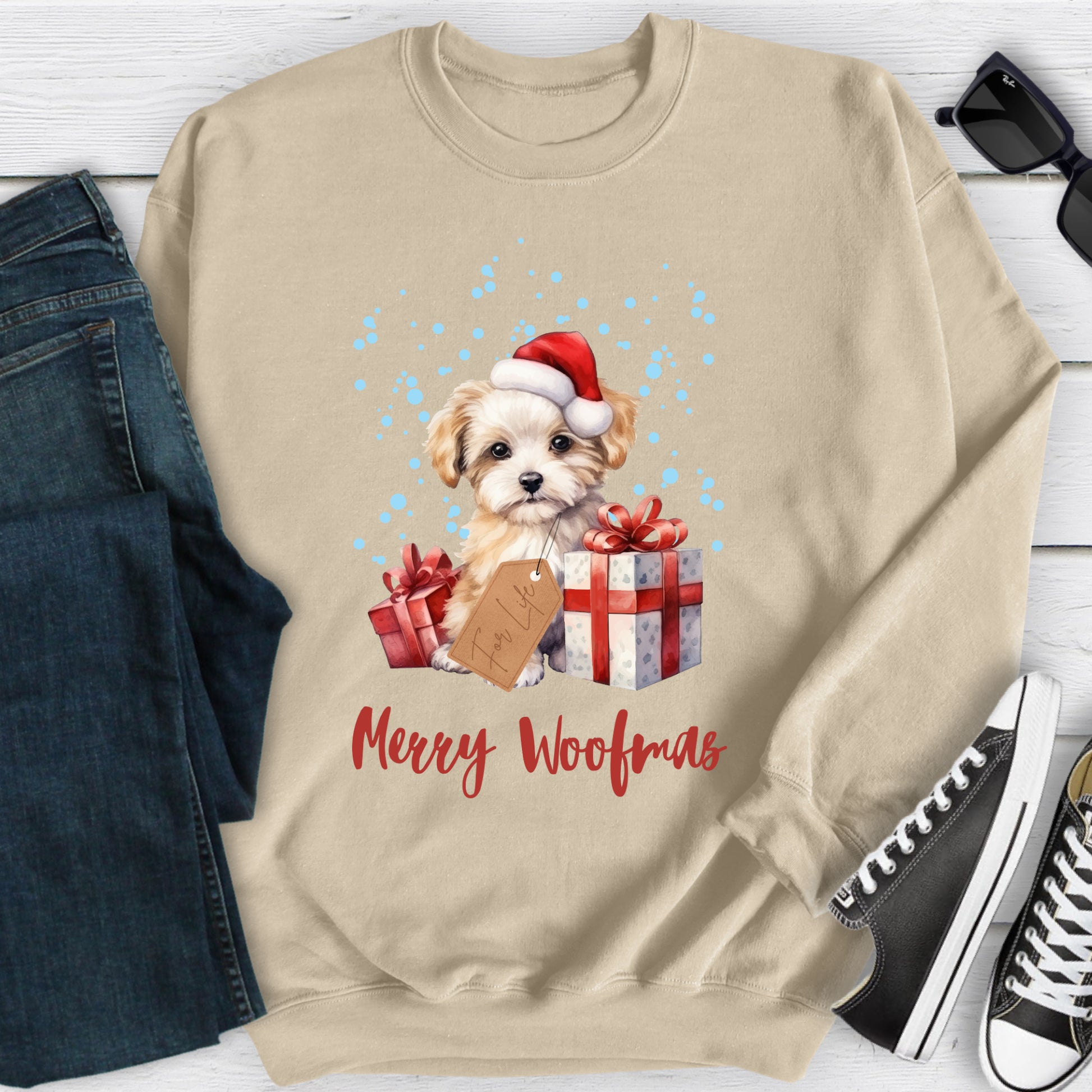 A puppy snow Christmas gift scene wishing you a merry woofmas. Cute dog Christmas is a great gift for dog lovers and a perfect Christmas gift idea.