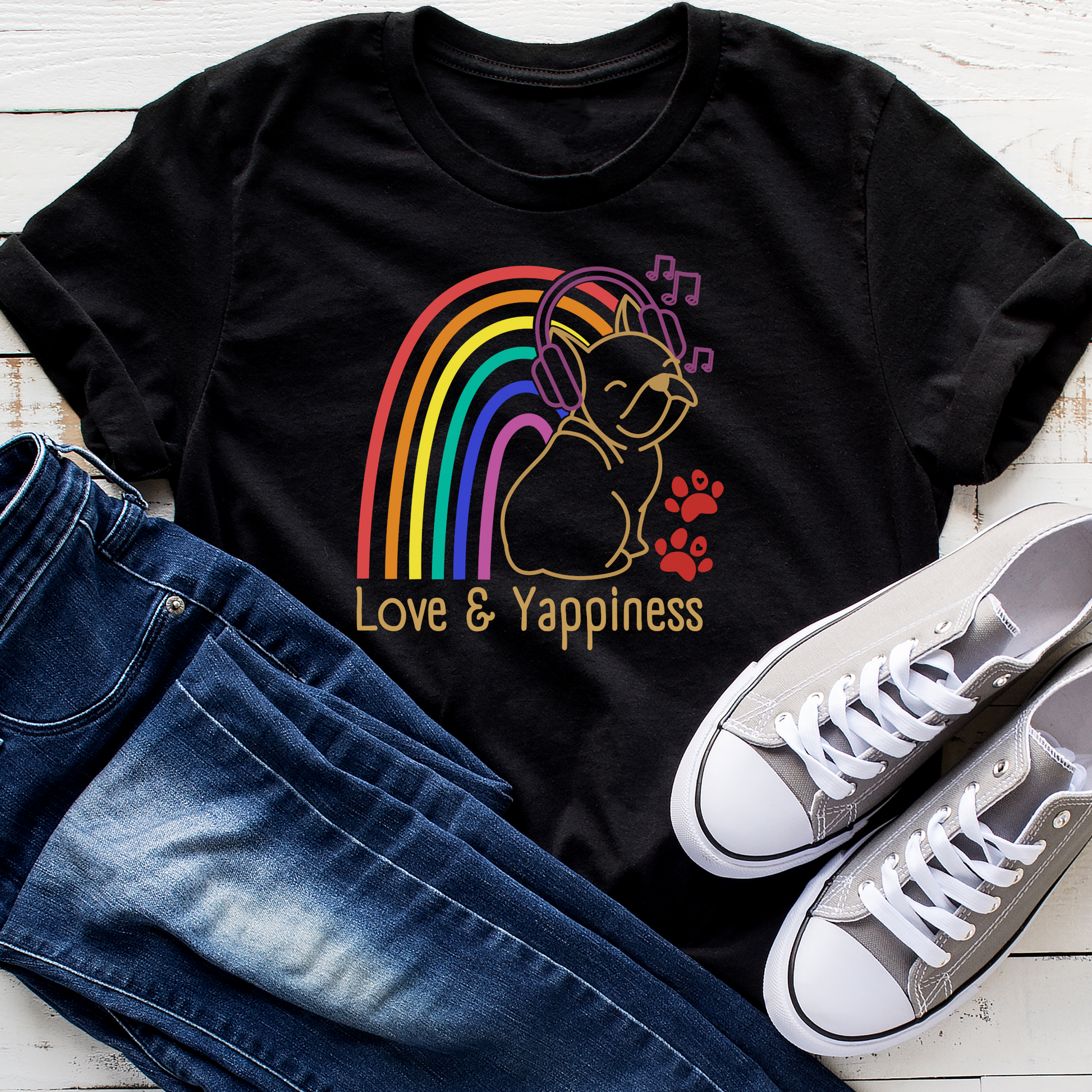 A cute happy music puppy outline with a rainbow of love and pride. The ideal dog lover design to spread love and yappiness.