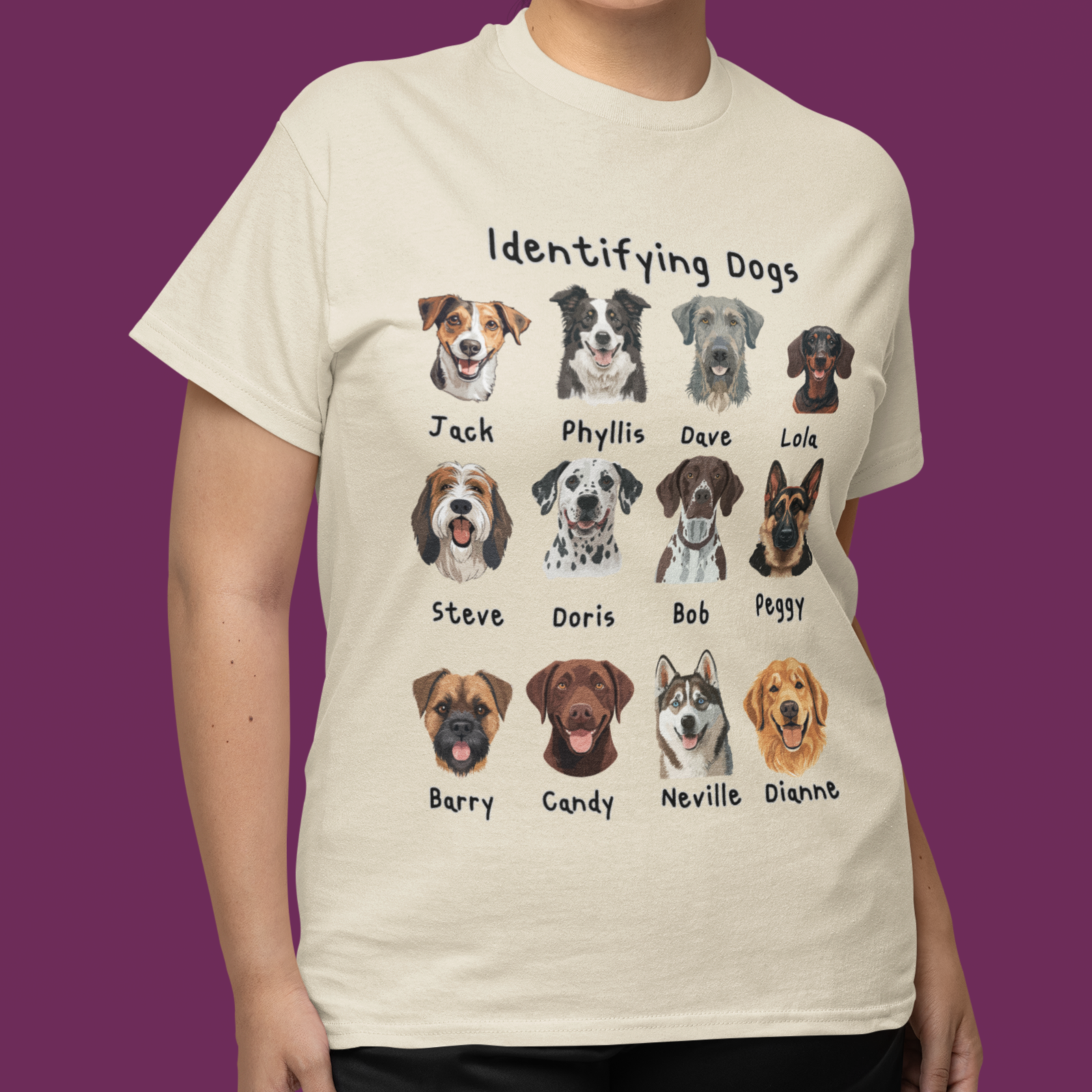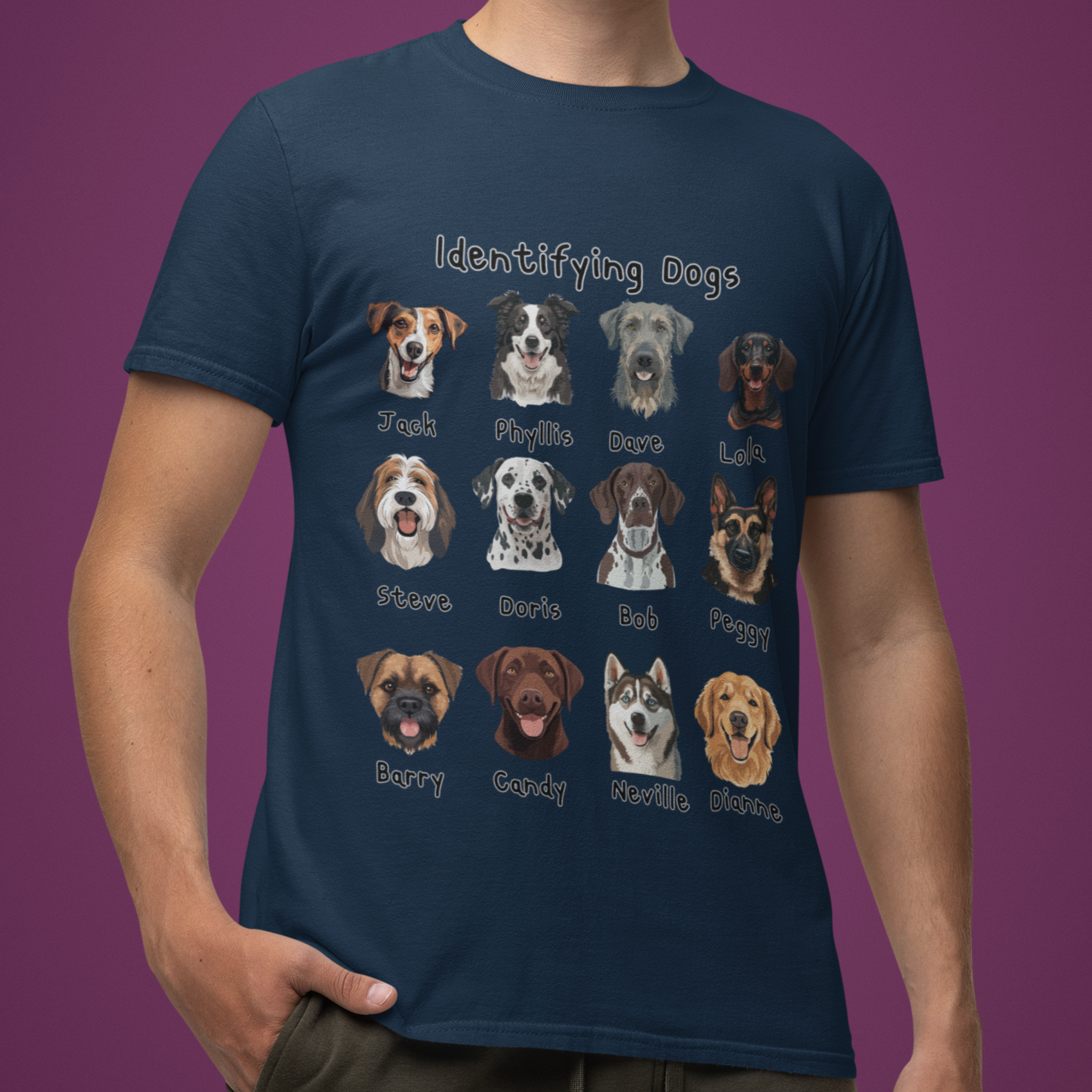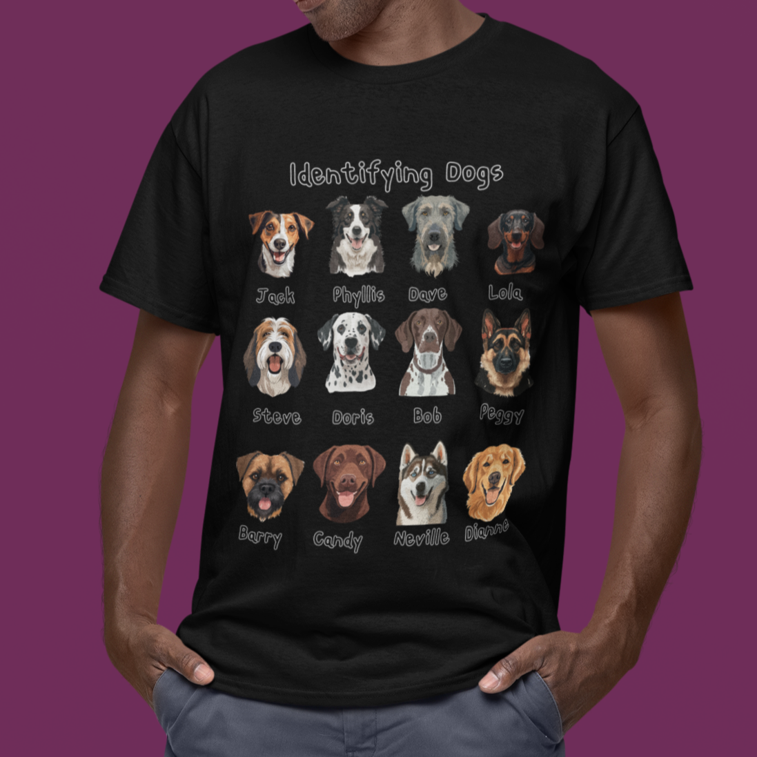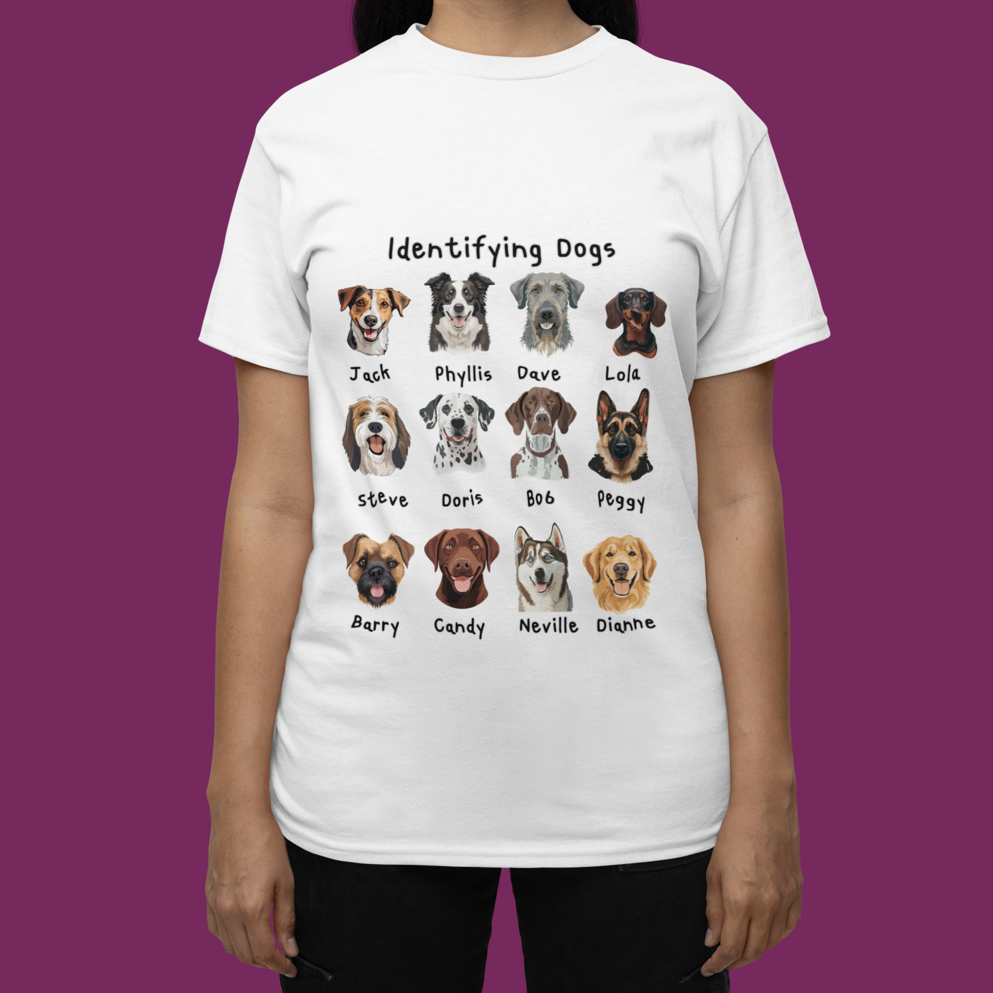 Looking for the perfect gift for a dog lover with a sense of humour? This “Identifying Dogs” t-shirt is a must-have! Featuring 12 adorable illustrated dog faces with quirky human names like Jack, Doris, and Neville, this tee is sure to get laughs and compliments wherever it’s worn. Whether you’re a proud pet parent, a dog walker, or just obsessed with pups, this shirt combines humour and heart in a stylish way. Great for birthdays, holidays, or just because!