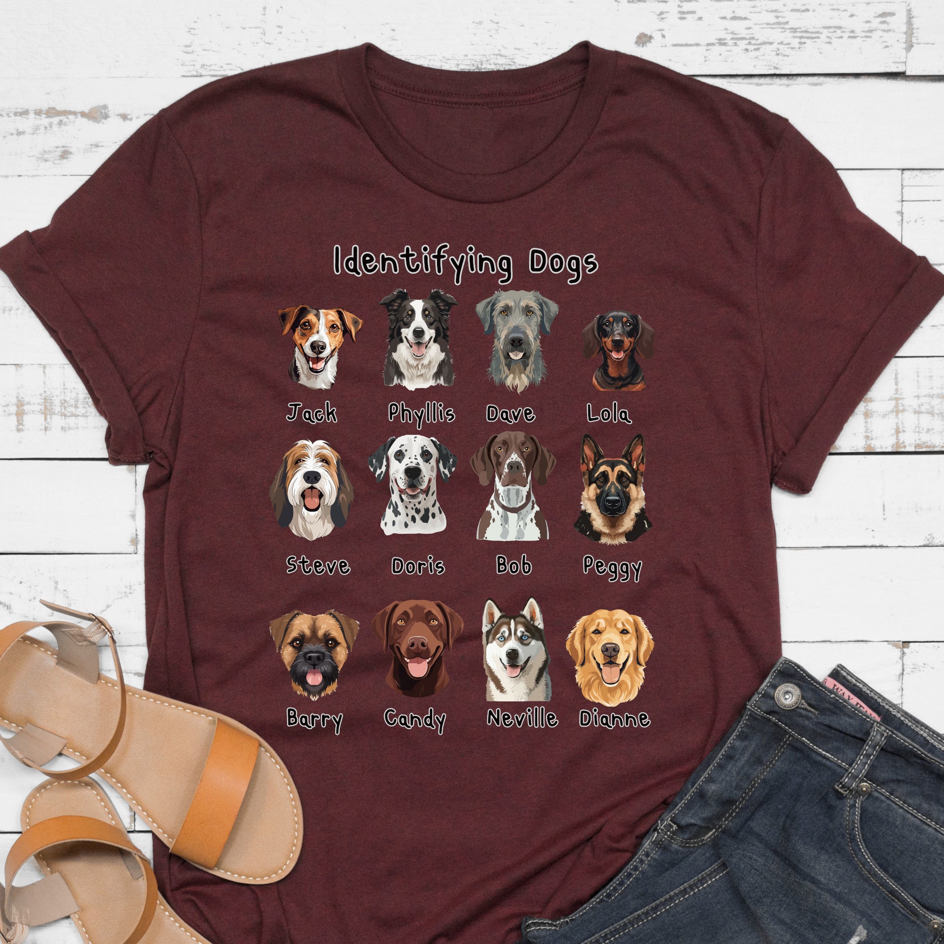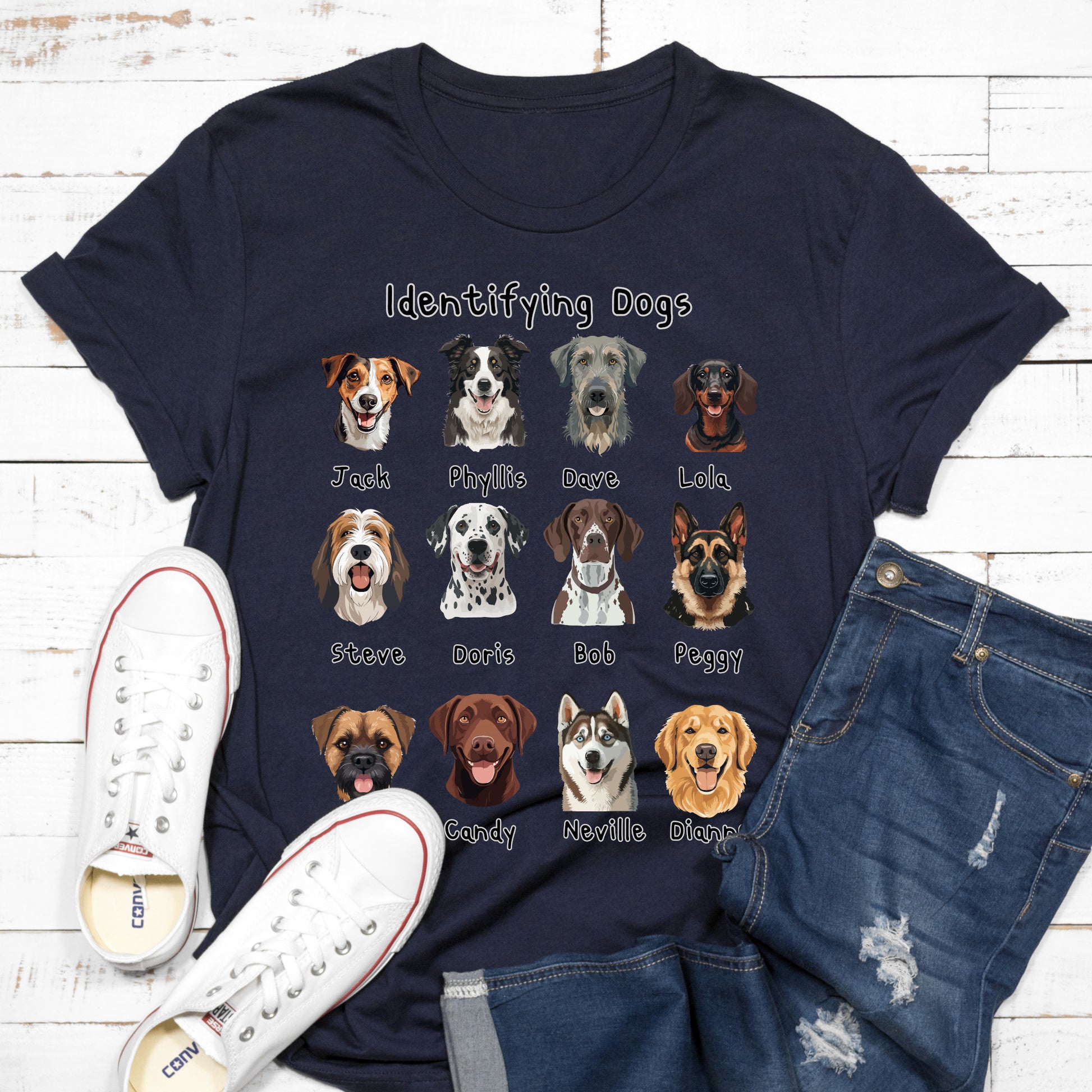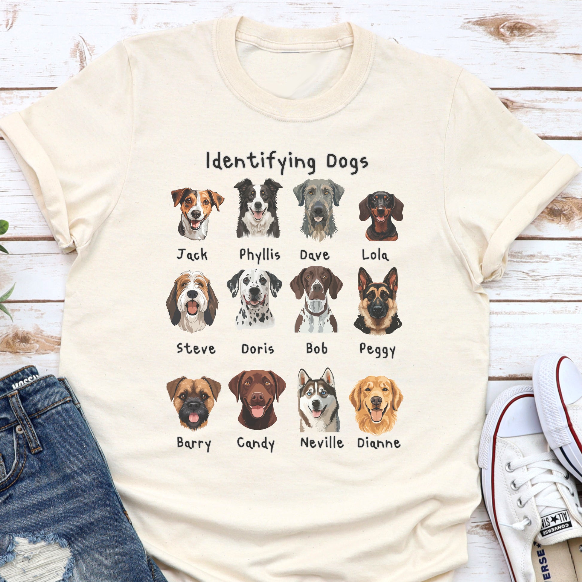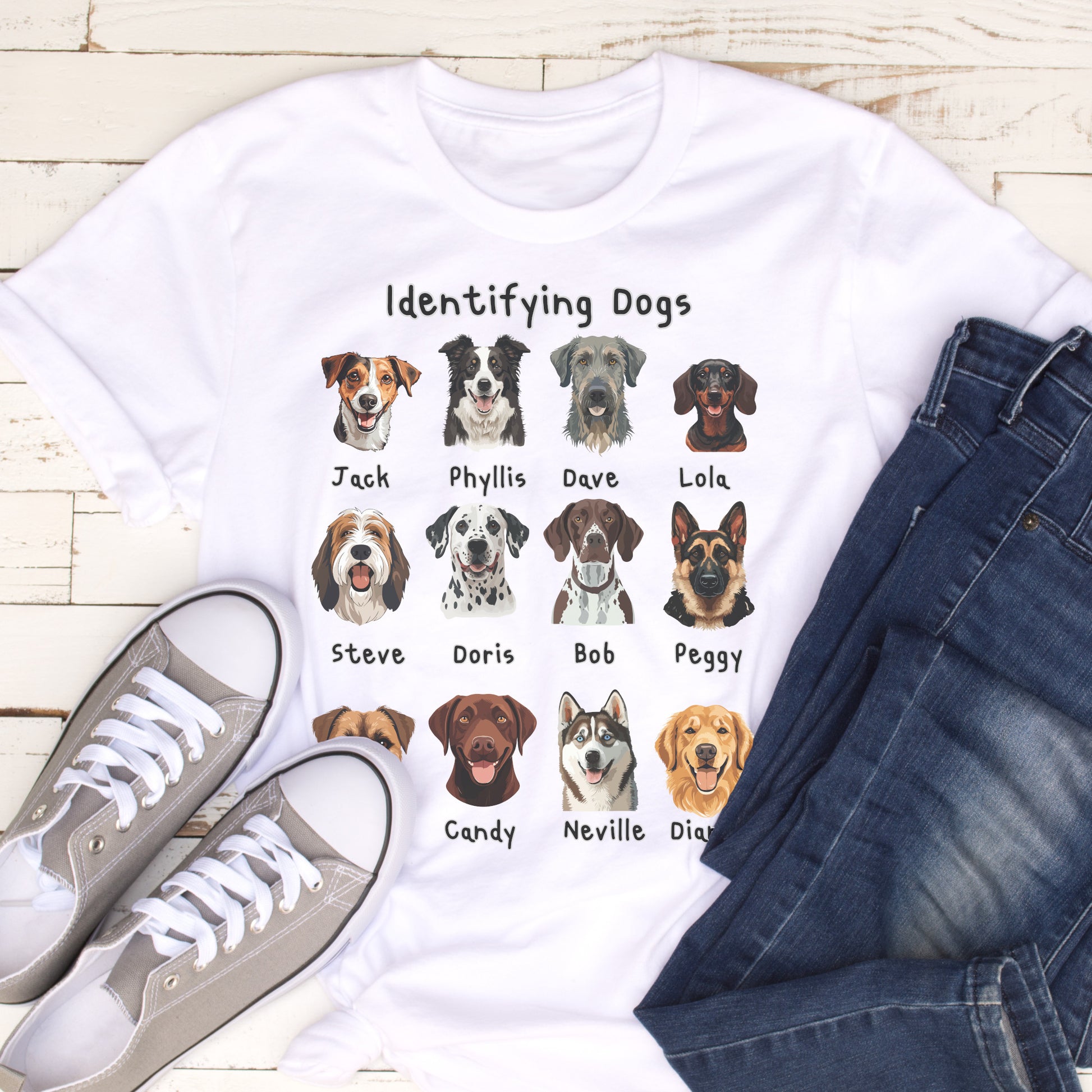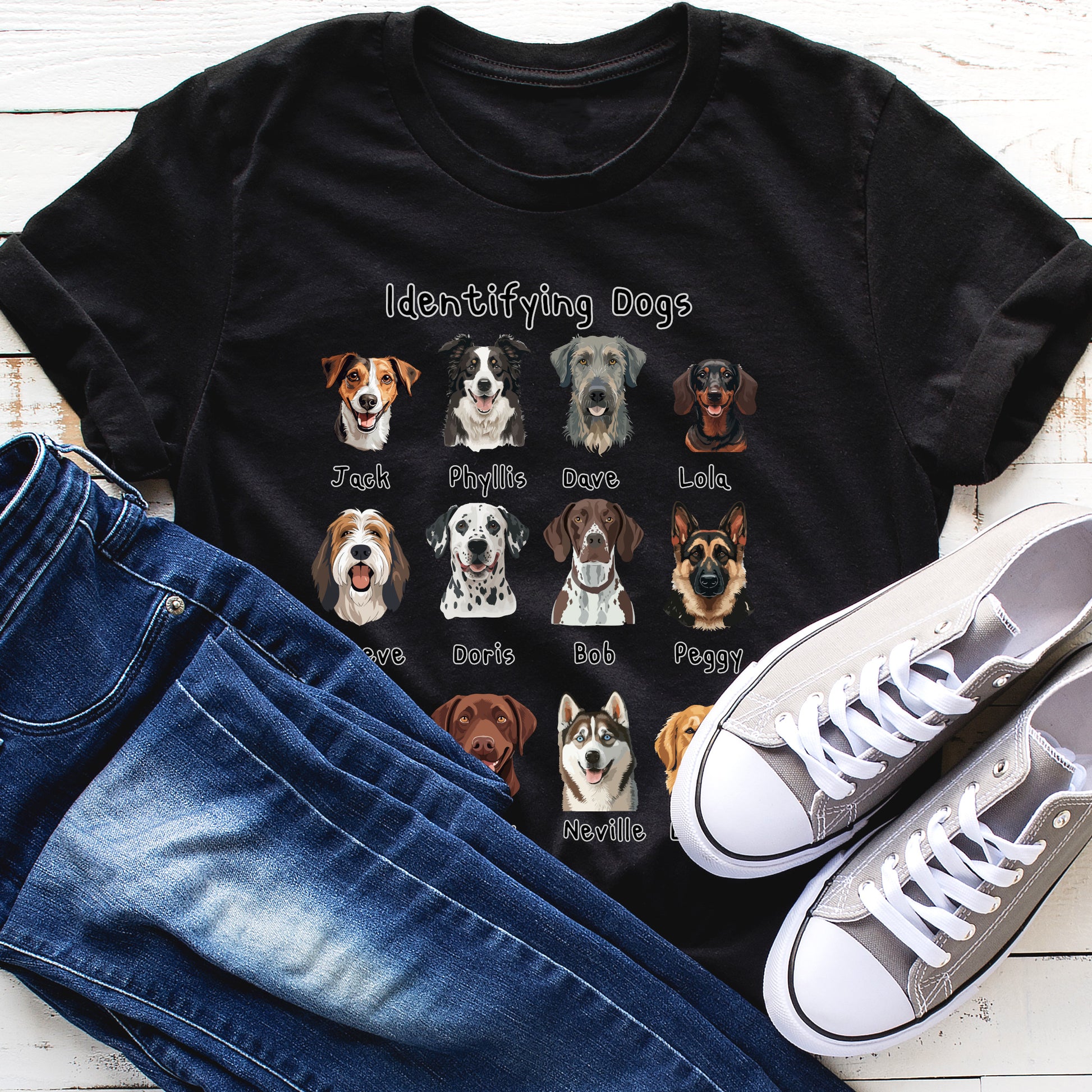 Looking for the perfect gift for a dog lover with a sense of humour? This “Identifying Dogs” t-shirt is a must-have! Featuring 12 adorable illustrated dog faces with quirky human names like Jack, Doris, and Neville, this tee is sure to get laughs and compliments wherever it’s worn. Whether you’re a proud pet parent, a dog walker, or just obsessed with pups, this shirt combines humour and heart in a stylish way. Great for birthdays, holidays, or just because!