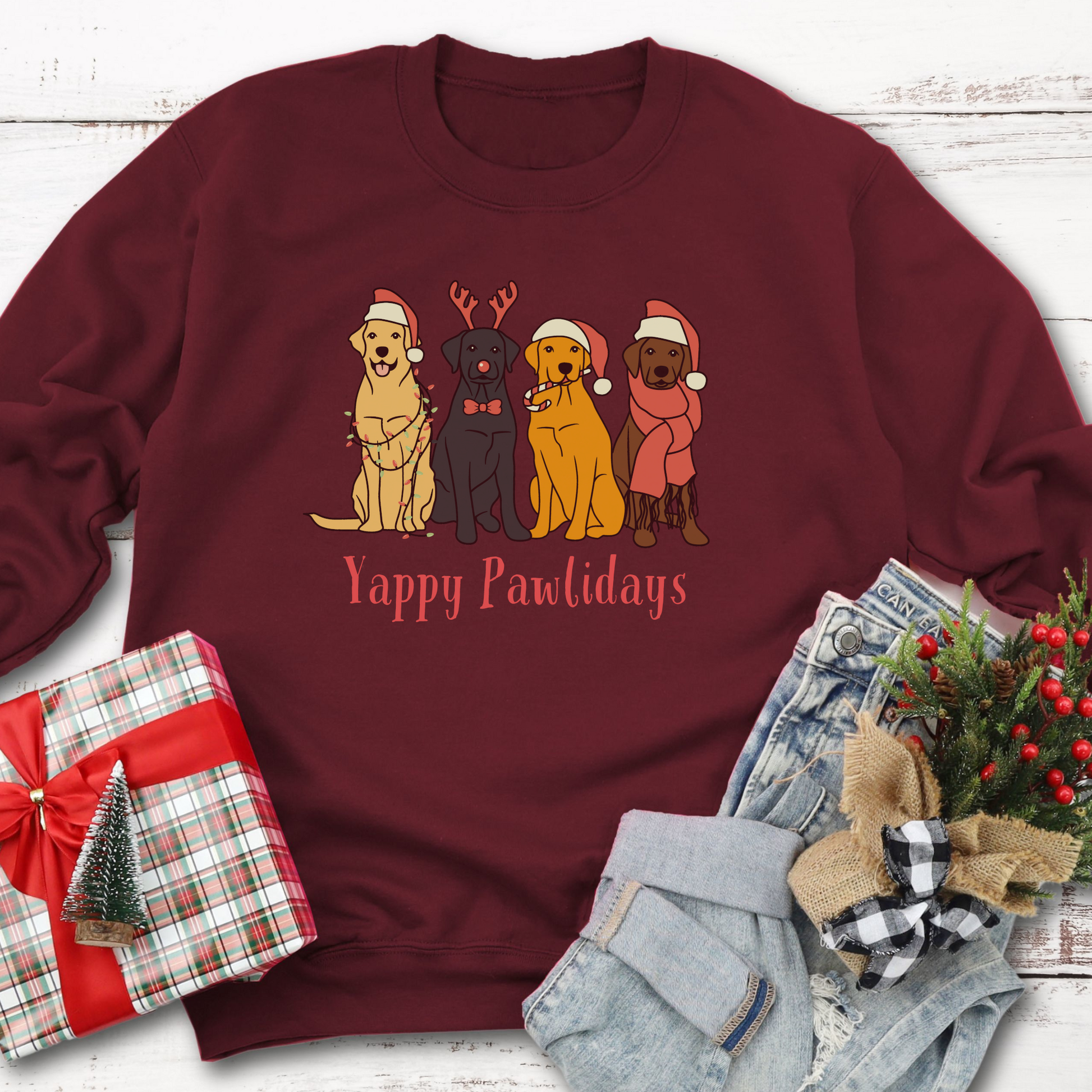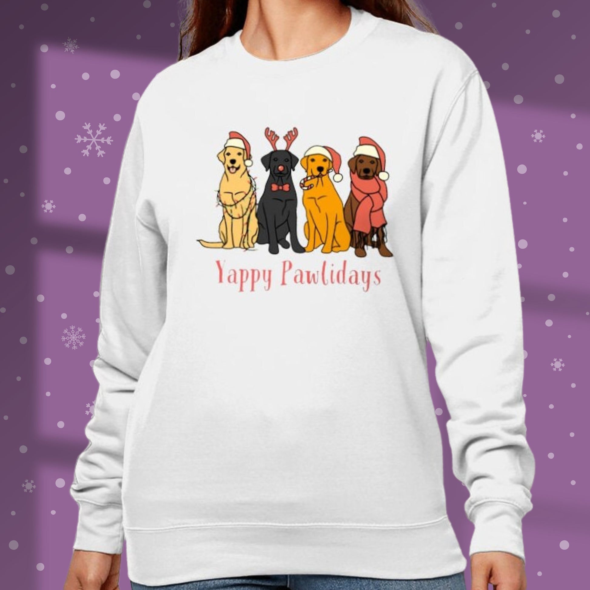 Christmas Labrador Christmas sweatshirt dog lover jumper makes a great Christmas gift for dog lovers. Dog in Santa hat and reindeer antlers with Yappy Pawlidays is a perfect design for Labrador owners and the ideal dog lover gift this Christmas for happy holidays.