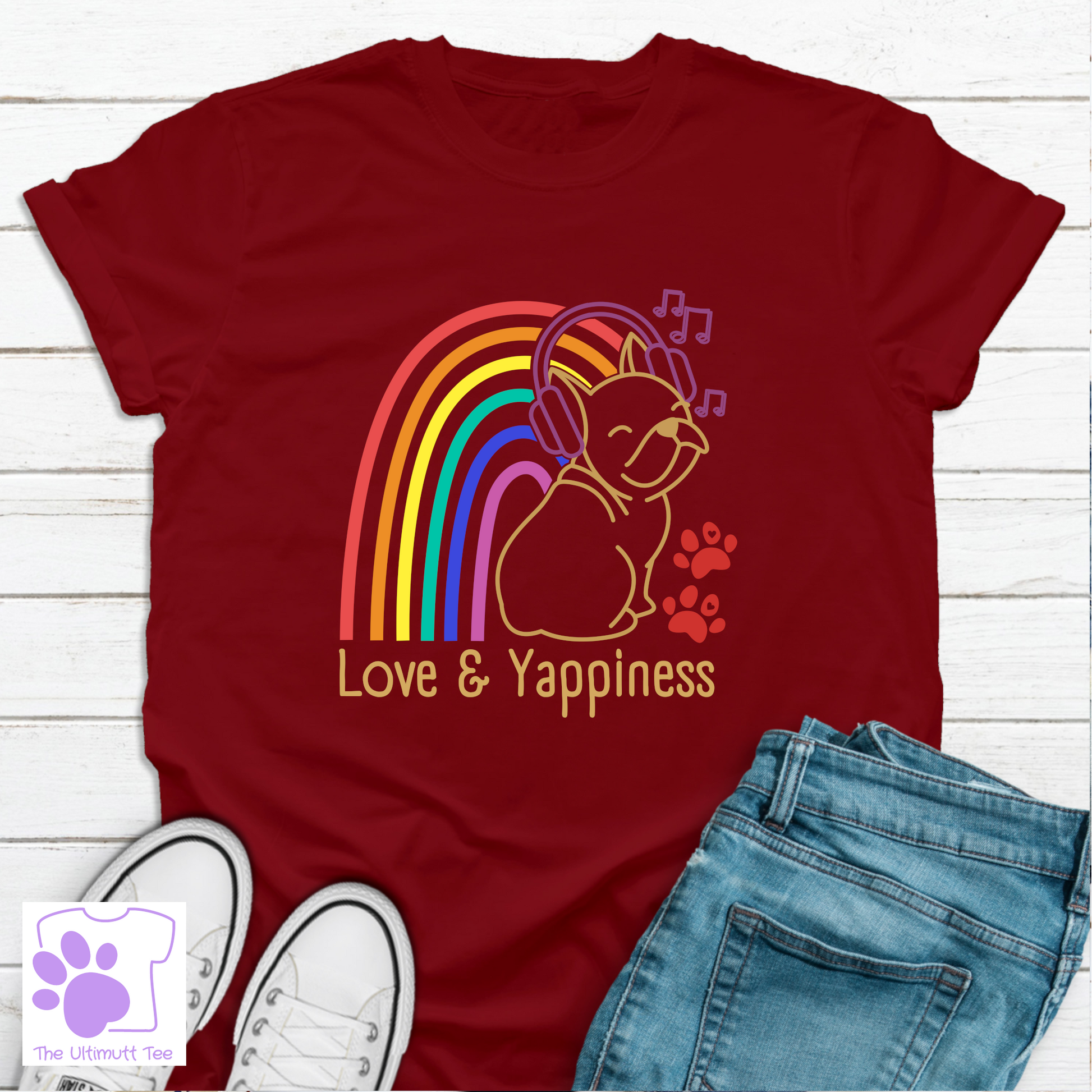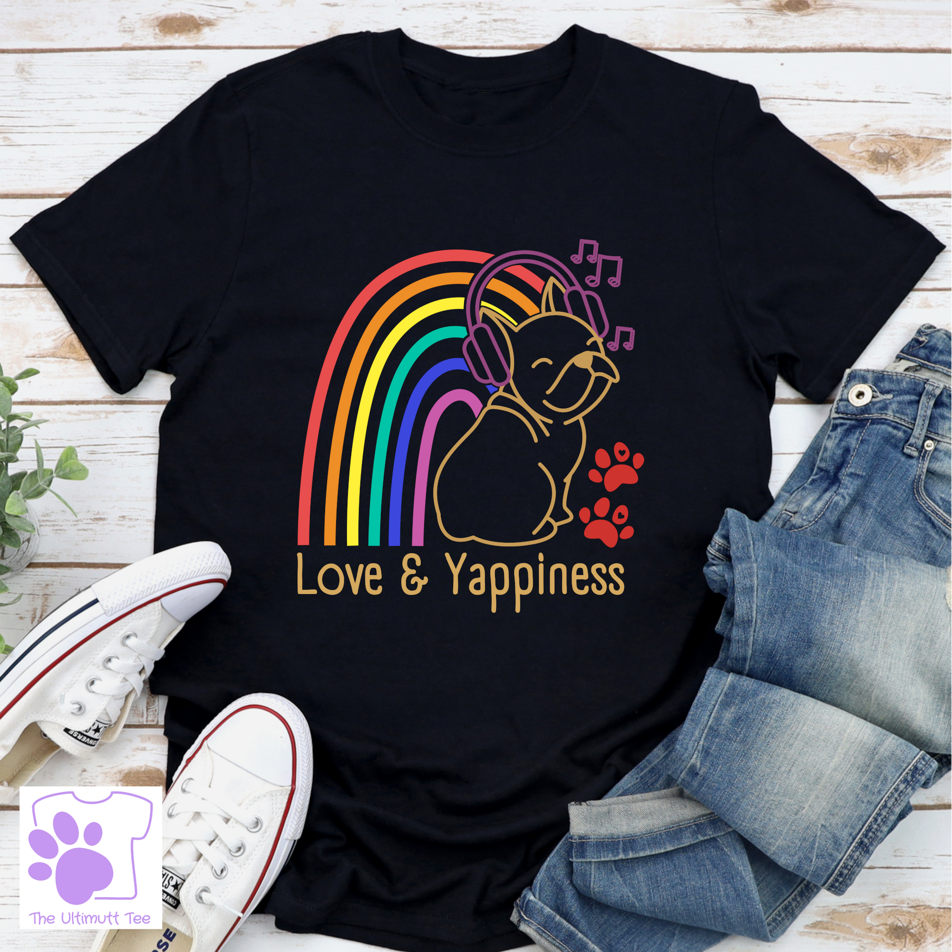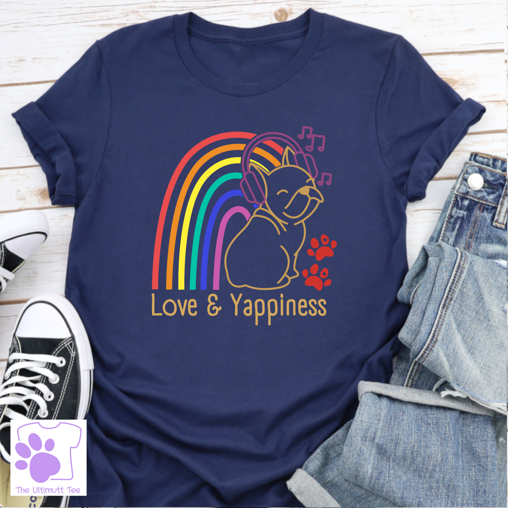 A cute happy music puppy outline with a rainbow of love and pride. The ideal dog lover design to spread love and yappiness. Colourful dog owner gift for dog lover.