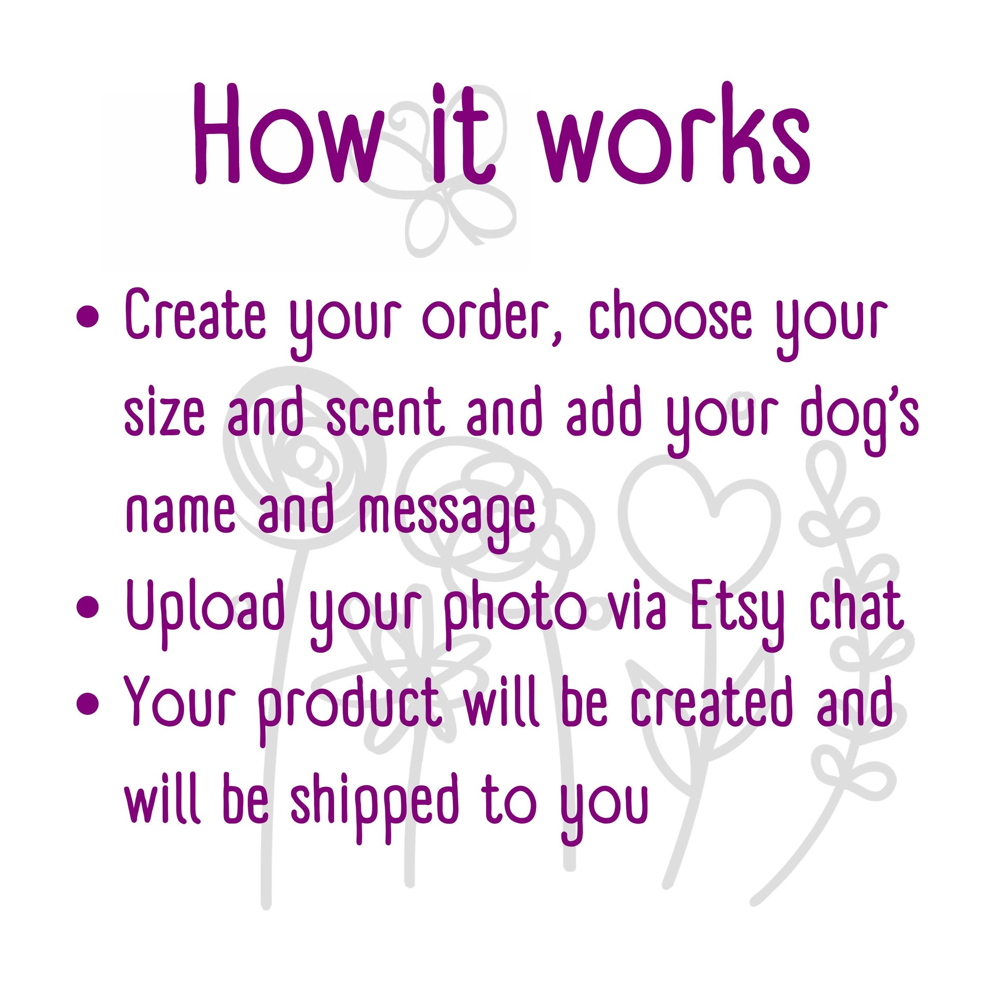 Choose your size and fragrance, add your dog's name and message then upload your photo via Etsy messages and you're all set to go.