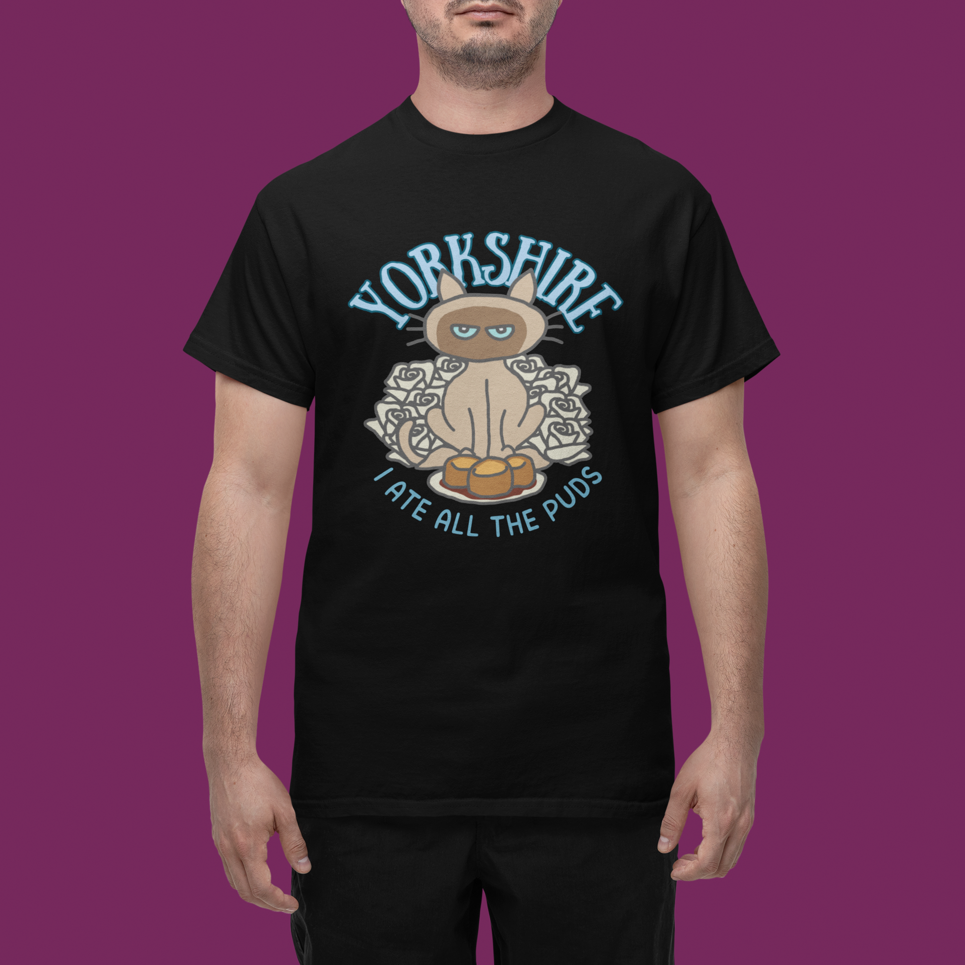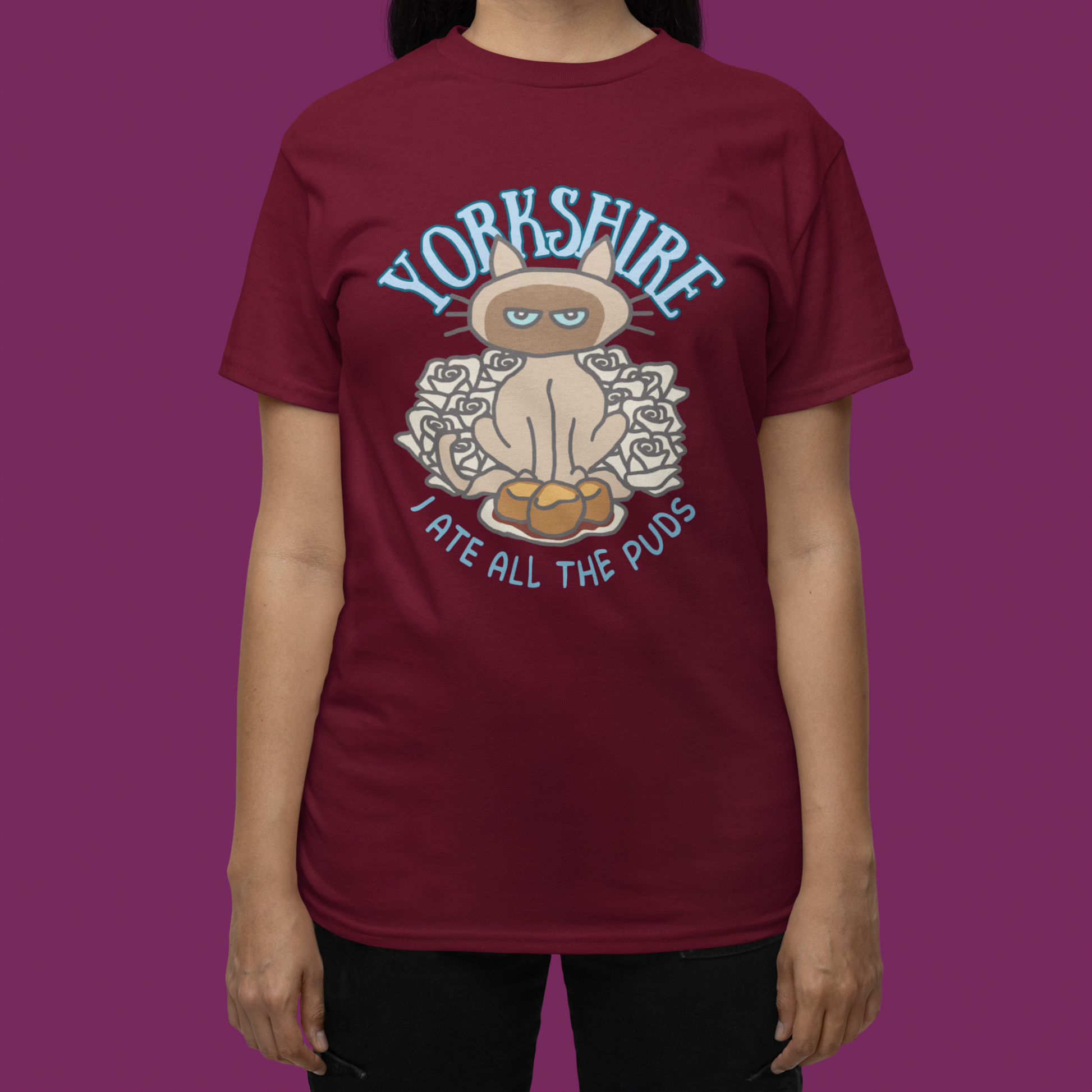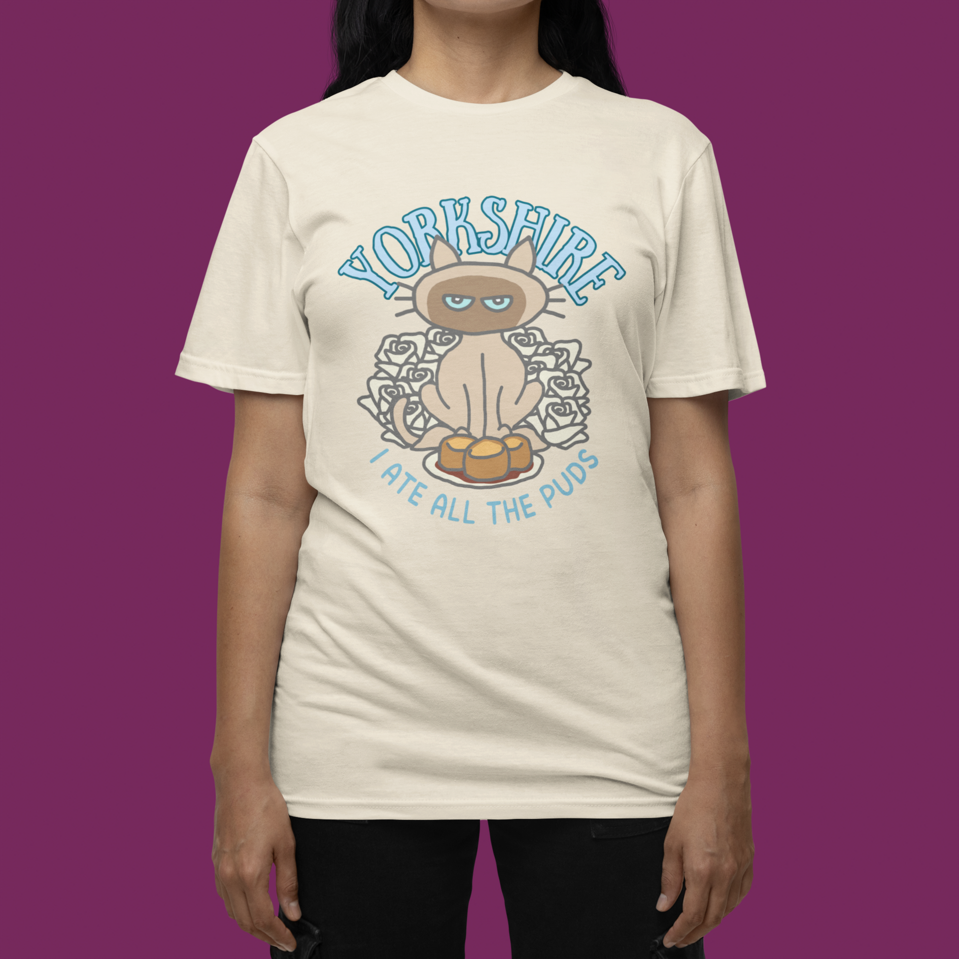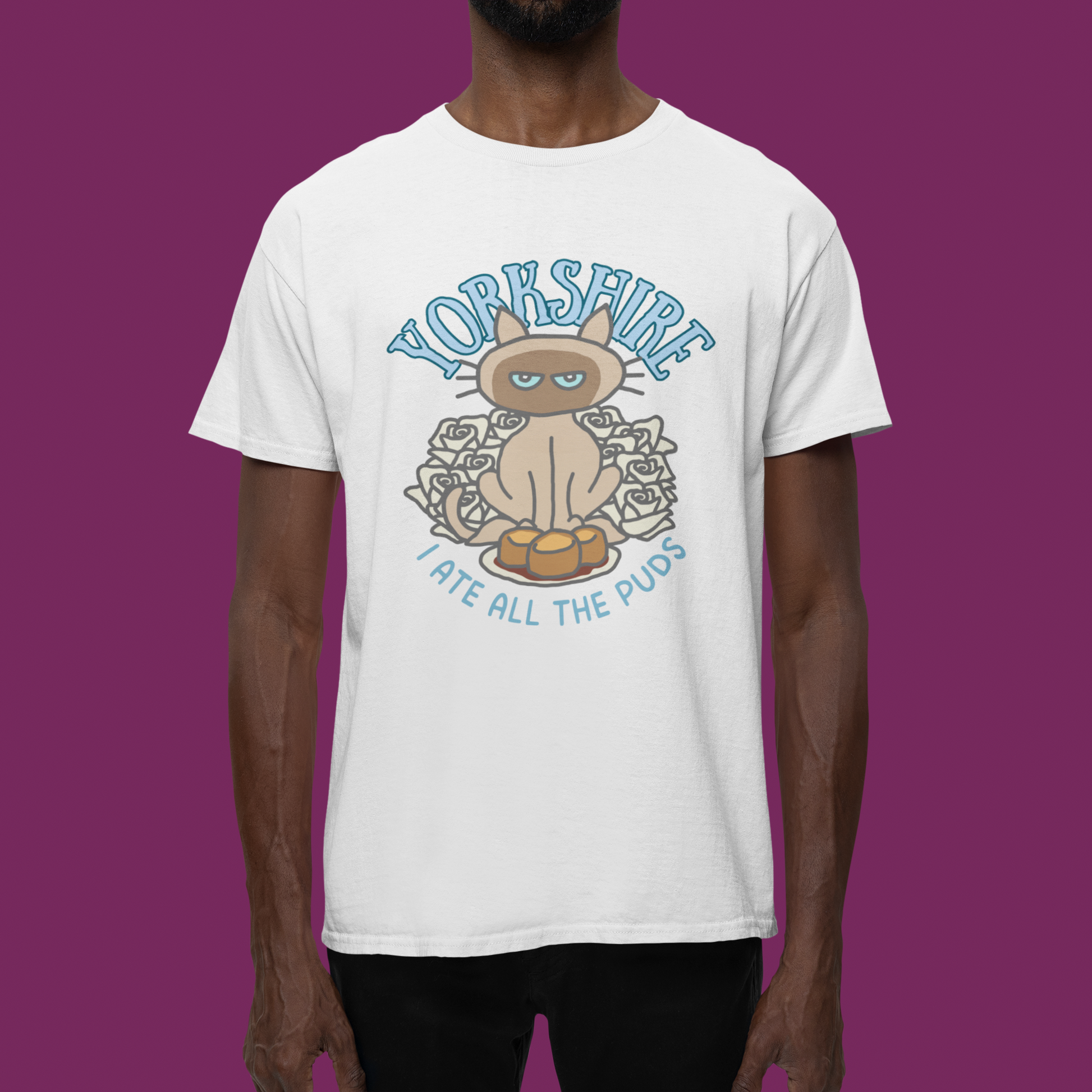 Celebrate your love for cats and Yorkshire with this adorable and humorous shirt! Featuring a sassy Siamese cat surrounded by Yorkshire roses and proudly sitting on a plate of Yorkshire puddings, this unique design is sure to make any Yorkshire local or cat lover smile. With the cheeky phrase “I ate all the puds”, it’s the perfect gift for cat mums, foodies, or anyone with a taste for Northern charm.