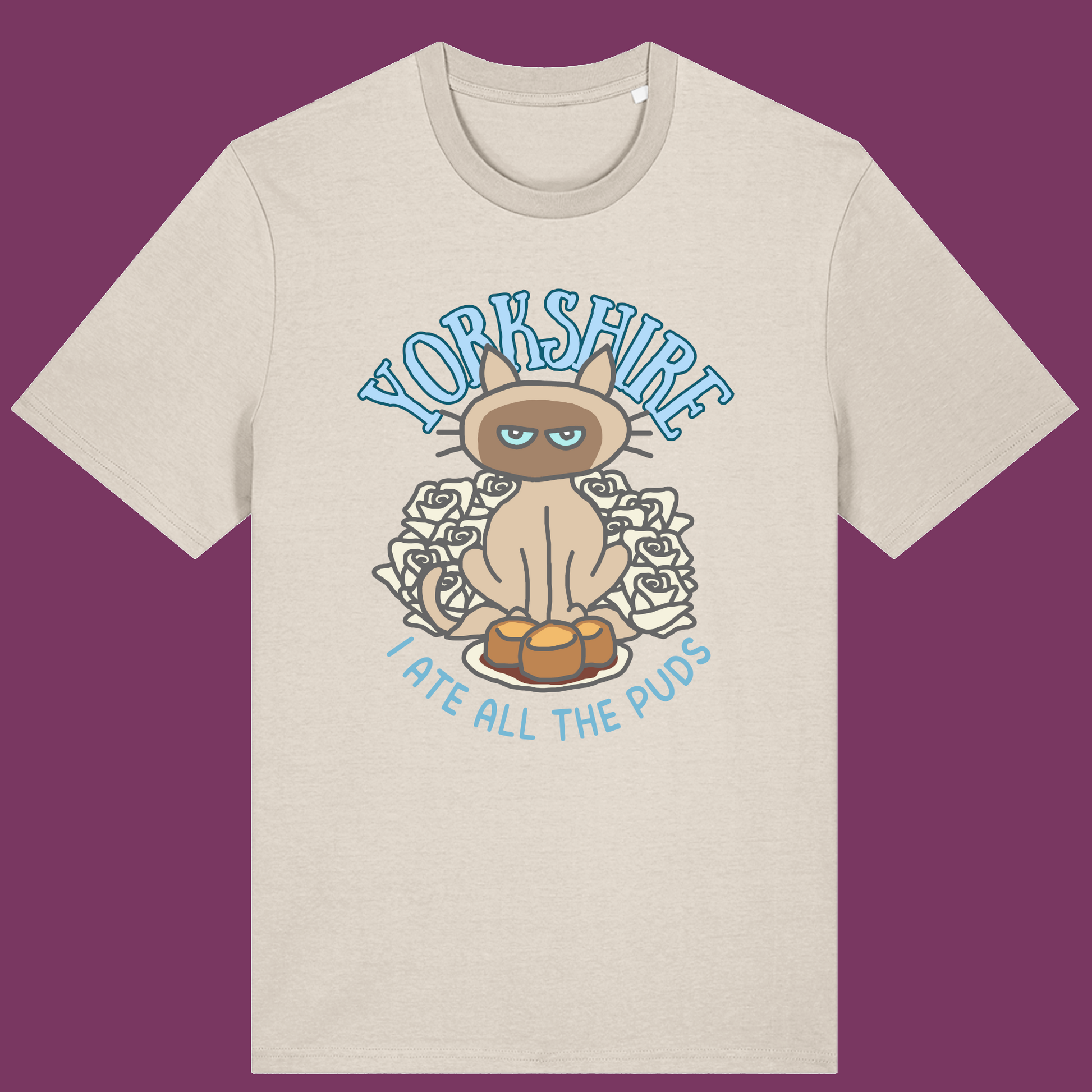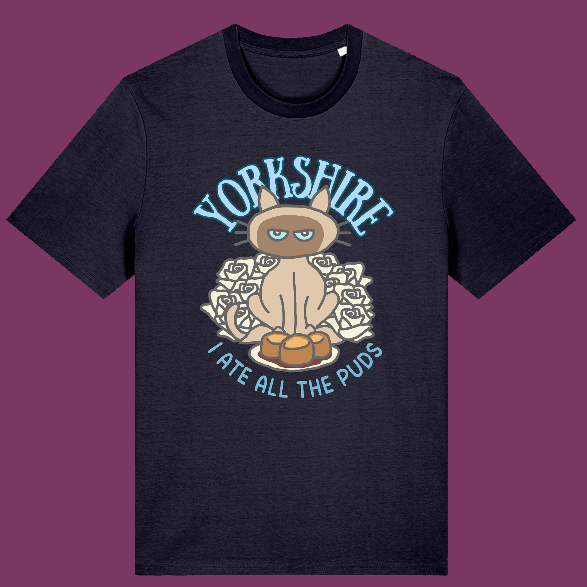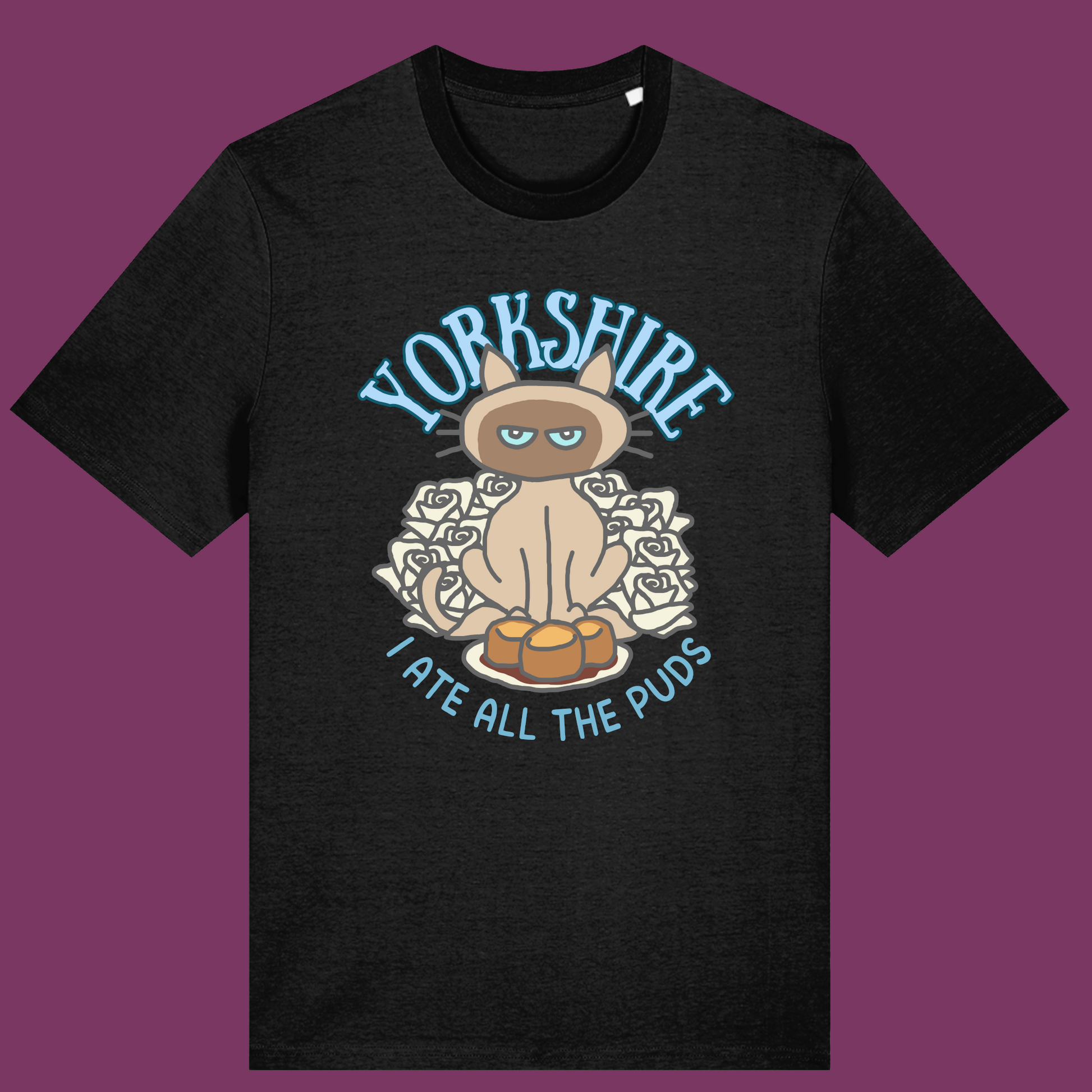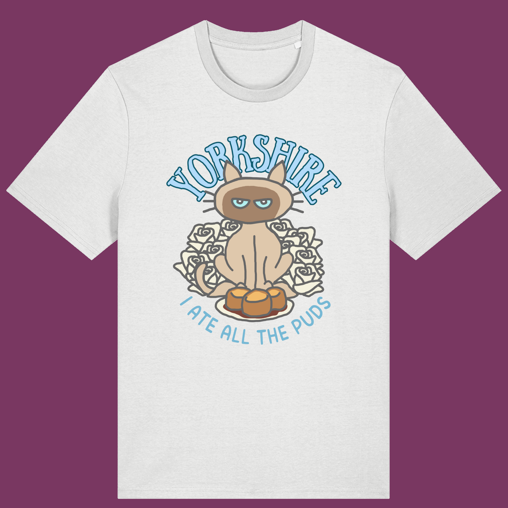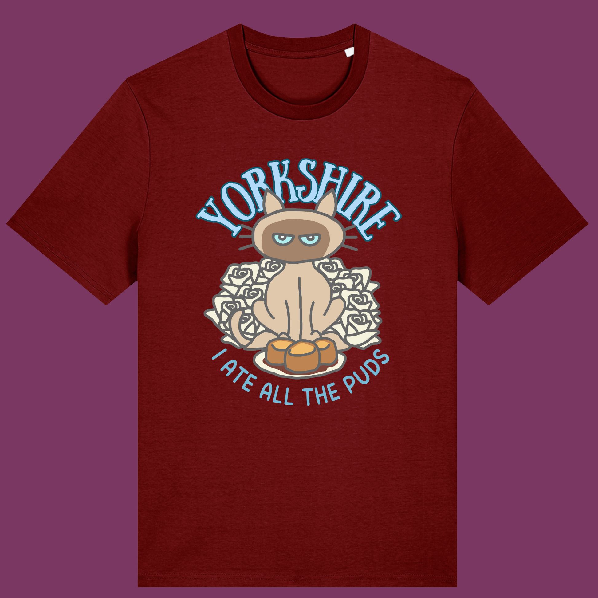 Celebrate your love for cats and Yorkshire with this adorable and humorous shirt! Featuring a sassy Siamese cat surrounded by Yorkshire roses and proudly sitting on a plate of Yorkshire puddings, this unique design is sure to make any Yorkshire local or cat lover smile. With the cheeky phrase “I ate all the puds”, it’s the perfect gift for cat mums, foodies, or anyone with a taste for Northern charm.